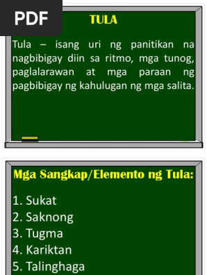 Mayroong labingdalawang sukat ang tulang ito. Isang uri ng panitikan na nagpapahayag ng kaisipan o diwa sa pamamagitan ng maayos at piling- piling mga salita a. Download as PPTX PDF TXT or read online from Scribd.